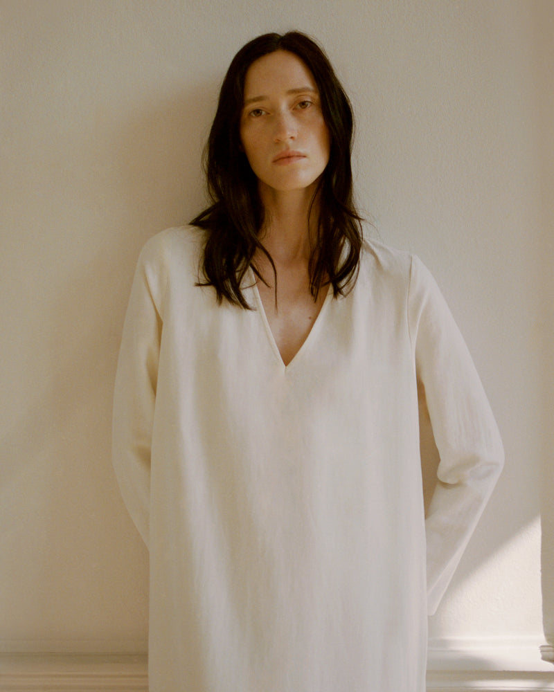 SS26 pays tribute to that calm space where beginnings take shape and presence is everything. The silhouettes are flowing, open, and deeply feminine. Each piece is designed to move with the body, not against it.