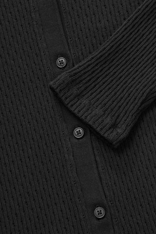 Eli Cardigan is a slim fit cardigan with a classic polo-shirt inspired collar. Fastened down the front by seven buttons, it is made from a textured jersey fabric and has double stitching at the hem and cuffs for a sporty vibe.