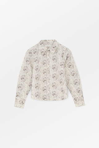 Fitted shirt with pointed collar, refined details and all over rose embroidery.