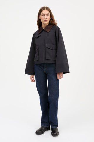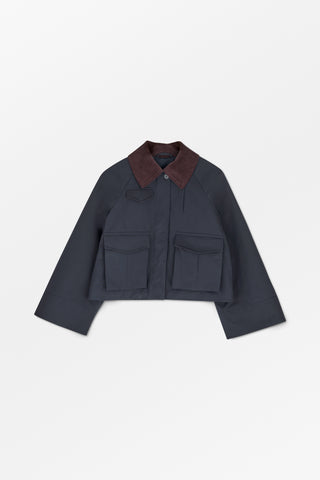 Short jacket with collar, raglan sleeves and multiple functional pockets.