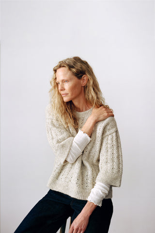 With Laurine, our idea was to create a spring knit with short sleeves and a feminine, lightweight feel. The pointelle pattern forms tiny holes, making it slightly see-through, and allowing you to play with what you wear underneath. We love knitwear year-round, but sometimes a high-neck, heavy cable knit isn’t ideal for a summer evening. Laurine offers the perfect alternative.