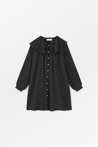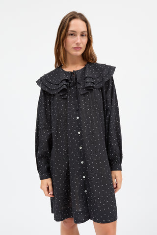Lilou Dress is a loose fit dress that flares out gently to fall just above the knees with a hem that is slightly lower at the back. A large collar comprising of three flounced layers spreads out over the shoulders and volume sleeves add to the silhouette. The dress is made from 100% organic cotton in a spot print and fastens up the front with buttons and a self-fabric tie at the neck.
