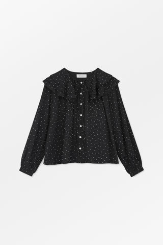 Lilou Shirt has a large collar made from three layered flounces spreading over the shoulders. Made from 100% organic cotton, the shirt has volume sleeves and a self-fabric loop tie at the neck. It fastens up the front with buttons and loops.