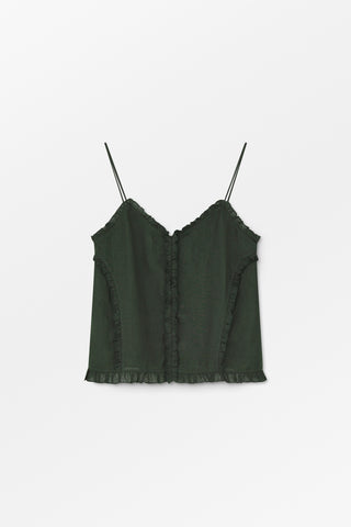 Madeleine Cami Top is a feminine camisole top with single layer ruffles running around the neck and hem and down the front and sides. The frills are neatly finished off with baby-lock stitching and the top hangs from fine roulou loop spaghetti straps that are adjustable for the perfect fit.